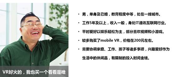 在研究中提煉到的第二類典型用戶也很有意思,他們是VR的跟風(fēng)購買者,同時,他們也是性價比追求者。他們清楚VR目前在這個階段尚不成熟,但同時又想跟風(fēng)體驗,所以他們不會花很大的價錢去追逐購買。他們也明白自己是跟風(fēng)體驗,所以只會為這種跟風(fēng)體驗支付相應(yīng)的低成本費(fèi)用,主要購買Mobile VR,價格在200元左右。也并不是他們付不起,只是覺得不值當(dāng)。