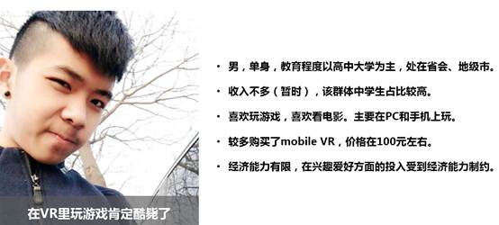 在定量研究中發(fā)現(xiàn)了一批我們原來沒有想到的用戶,他們以學(xué)生群體居多。正是精力旺盛的年齡里他們熱愛一切新鮮事物,愛玩游戲,越刺激越好。奈何迫于收入的限制購買的以Mobile VR為主,價格在100元左右。他們也知道幾千塊的體驗更好,但是當(dāng)下只能買個便宜的過過癮。