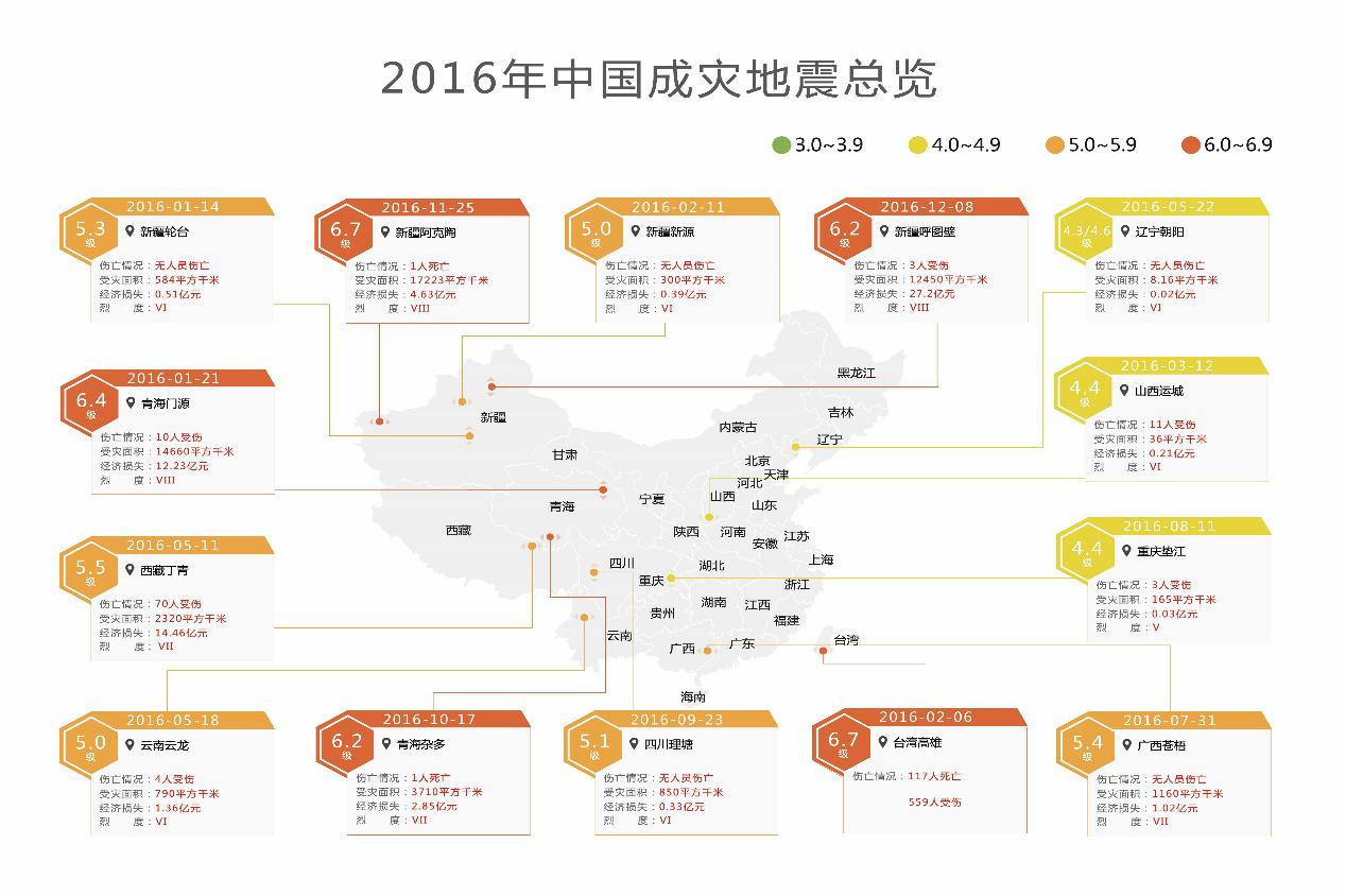 中國(guó)地震臺(tái)網(wǎng)中心官方數(shù)據(jù)顯示,2016年1月1日至12月20日,中國(guó)大陸地震共造成災(zāi)害事件15次,較大地震災(zāi)害3次,一般地震災(zāi)害12次,共造成2人死亡,101人受傷,直接經(jīng)濟(jì)損失65.5億元。