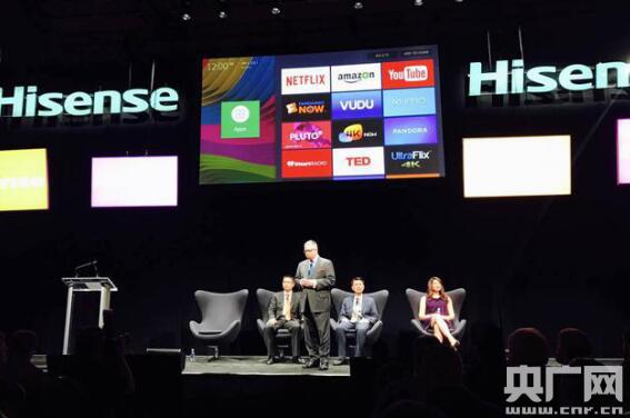 中國(guó)家電廠(chǎng)商海信(Hisense)在CES消費(fèi)電子展商發(fā)布會(huì)雙色4K激光電視新品。