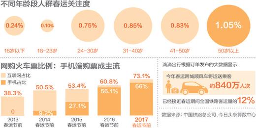 最關(guān)注春運(yùn)的是什么人?按照鐵總與今日頭條聯(lián)合發(fā)布的數(shù)據(jù)報(bào)告,50歲以上人群相較其他年齡段更關(guān)注春運(yùn)。這個(gè)結(jié)果與社會(huì)的普遍印象不同,人們似乎更傾向于認(rèn)為,外出的求學(xué)者和就業(yè)者是形成春運(yùn)的主要成因,而50歲以上人群顯然不是這兩個(gè)人群的主力。