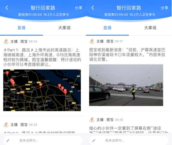 除了在百度地圖“智行回家路”直播間查看權(quán)威交通信息發(fā)布,每一位用戶也可以在“大家說(shuō)”版塊兒發(fā)布消息,分享自己周邊的路況或突發(fā)事故給他人提供參考,群策群力讓春節(jié)返鄉(xiāng)更暢通、更高效。