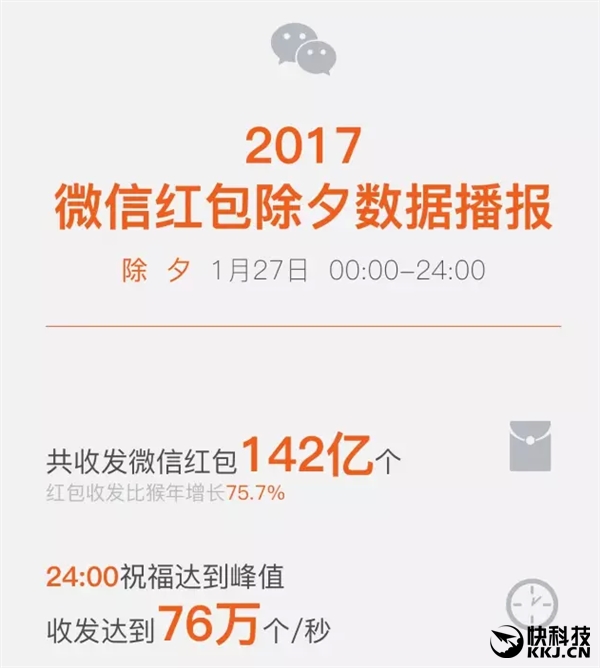 據(jù)微信官方數(shù)據(jù),1月27日除夕全天,微信紅包共收發(fā)多達(dá)142億個,比猴年除夕猛增了75.7%。