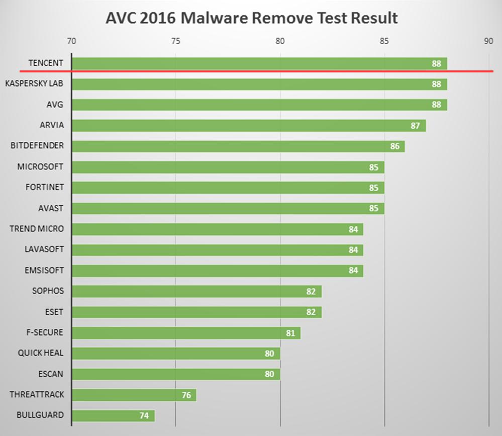同時(shí),值得一提的是,清除測(cè)試系騰訊電腦管家(英文版)2016年首次參測(cè)的項(xiàng)目,在和卡巴斯基、AVG等國際知名殺軟的同場(chǎng)競(jìng)技中,騰訊電腦管家(英文版)憑借自研殺毒引擎TAV,以出色的清除能力取得最高分,與卡巴斯基、AVG并列排名世界第一,榮獲“A+”最高評(píng)級(jí)。觀察清除測(cè)試結(jié)果還可以發(fā)現(xiàn),在18款參測(cè)的殺毒軟件中,騰訊電腦管家是唯一一個(gè)登榜的國產(chǎn)殺軟品牌,這代表著國產(chǎn)殺軟在惡意文件清除能力上已經(jīng)到達(dá)了世界領(lǐng)先水平。