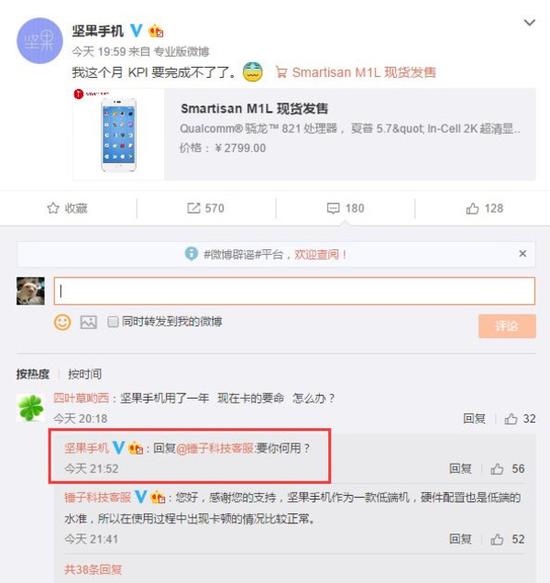 一名網(wǎng)友在這條微博下方留言:堅果手機(jī)用了一年,現(xiàn)在卡的要命怎么辦?@錘子科技客服立即回復(fù):堅果手機(jī)作為一款低端機(jī),硬件配置也是低端的水準(zhǔn),所以在使用過程中出現(xiàn)卡頓的情況也比較正常。如此答復(fù),還真是一名耿直的客服,但是堅果手機(jī)官微調(diào)侃說到,“要你何用”,網(wǎng)友們紛紛表示這倆客服真是得老羅真?zhèn)鳌?/p>