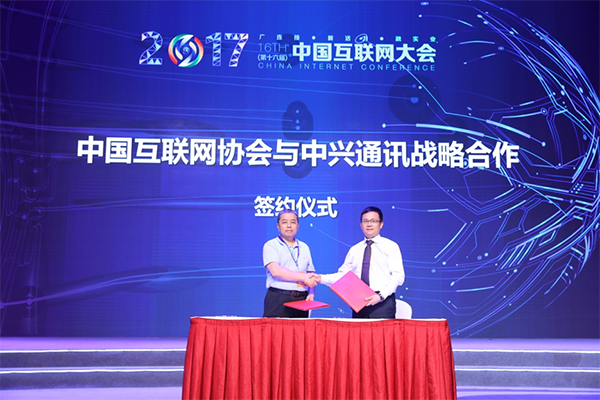 中國(guó)互聯(lián)網(wǎng)協(xié)會(huì)秘書(shū)長(zhǎng)盧衛(wèi)與中興通訊股份有限公司高級(jí)副總裁兼政企中國(guó)事業(yè)部總經(jīng)理朱永濤簽署戰(zhàn)略合作協(xié)議