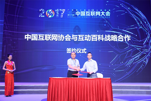中國(guó)互聯(lián)網(wǎng)協(xié)會(huì)秘書(shū)長(zhǎng)盧衛(wèi)與互動(dòng)百科創(chuàng)始人潘海東董事長(zhǎng)簽署戰(zhàn)略合作協(xié)議
