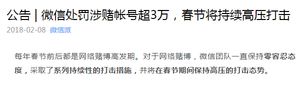 日前,微信派公布了春節(jié)期間對于涉嫌網絡賭博的處罰公告——《公告 | 微信處罰涉賭帳號超3萬,春節(jié)將持續(xù)高壓打擊》。