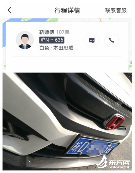3月24日9時(shí)許,東方網(wǎng)記者在上;疖囌靖浇ㄟ^“美團(tuán)打車”叫了一輛快車,車牌顯示為“滬N**636”。車輛到達(dá)后,記者卻發(fā)現(xiàn)這竟然是輛外地牌照的車,牌照為“皖D**436”,與其客戶端顯示信息不符。