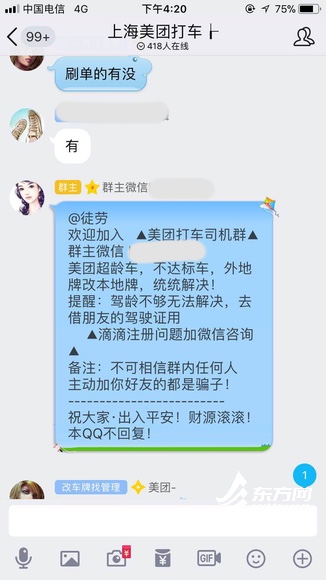 “外地牌照做網(wǎng)約車的不少,而且現(xiàn)在美團(tuán)正在大量招募司機(jī),不會(huì)查得很嚴(yán)!边@位從事網(wǎng)約車已近4年的司機(jī)還向記者道出了內(nèi)行所知的“門道”:“一般外地車輛改一個(gè)滬牌需要400到600元,我已經(jīng)推薦幾個(gè)朋友試過了,沒什么問題!彼向記者展示了“美團(tuán)打車”的一個(gè)上海司機(jī)QQ群,群內(nèi)寫明:“美團(tuán)超齡車,不達(dá)標(biāo)車,外地牌改本地牌,統(tǒng)統(tǒng)解決。駕齡不夠三年的,統(tǒng)統(tǒng)搞定!