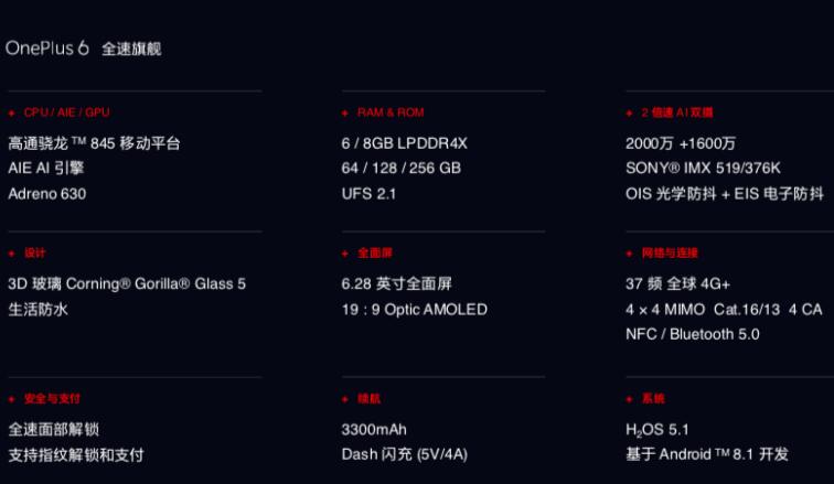 配置方面,一加手機(jī)6搭載高通驍龍?845移動(dòng)平臺(tái)處理器,最高8GB RAM+256GB ROM存儲(chǔ)配置,采用玻璃機(jī)身搭配金屬中框的設(shè)計(jì),正面一塊6.28 英寸全面屏,支持面部識(shí)別。