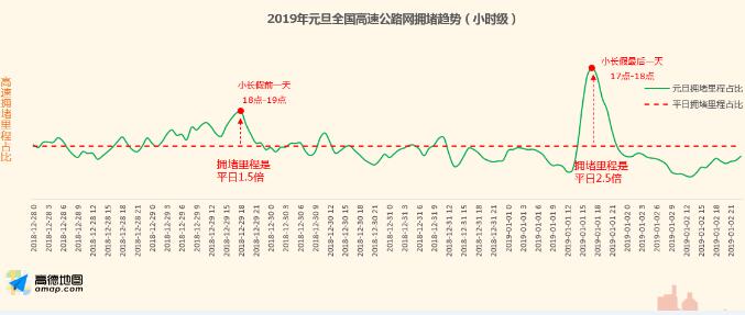 從擁堵時間來看,全國高速出程擁堵主要出現(xiàn)在小長假前一天傍晚,即2018年12月29日17點-19點,擁堵里程為平日1.5倍,返程1月1日15點-20點擁堵程度較高,峰值出現(xiàn)在17點-18點,擁堵里程為平日2.5倍。