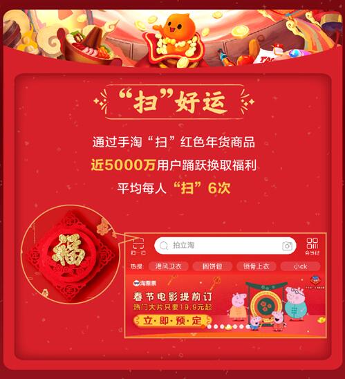今年,支付寶首次聯(lián)動淘寶每天派送100萬張?。消費者打開手機淘寶,點擊首頁左上角“掃一掃”或者搜索框“拍立淘”,對準紅色的年貨商品,識別后即可以有機會獲得支付寶?ɑ蛘呓鹭i等實物獎勵。淘寶數(shù)據(jù)顯示,近5000萬用戶踴躍換取淘寶派送的新春福利,平均每人“掃”6次紅色年貨。
