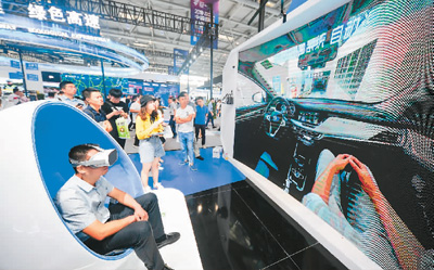 2019中國國際智能產(chǎn)業(yè)博覽會上,在東贏恒康控股集團(tuán)展臺,一名參觀者通過VR體驗(yàn)無人駕駛汽車自動入庫停車。