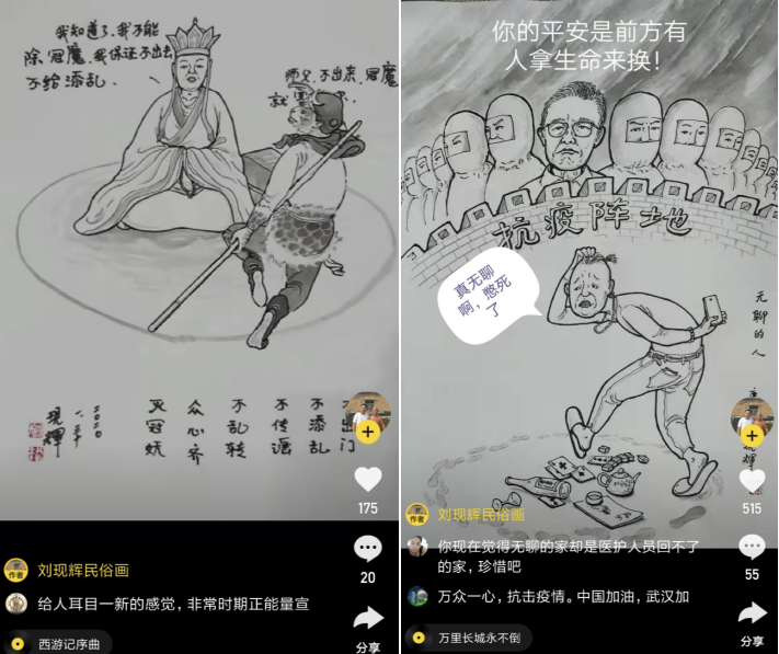 民俗畫家、漫畫家“劉現(xiàn)輝民俗畫”(ID:liuxianhui999)通過(guò)漫畫的形式宣傳抗疫。他上傳的動(dòng)畫版作品顯示,孫悟空手拿金箍棒為師傅唐僧畫了一個(gè)安全的圈,叮囑師父不要出來(lái),“不出來(lái),冠魔就害不了你”。唐僧回答道:“我知道了,我不能除冠魔,我保證不出去,不給添亂!甭嬒路,還有劉現(xiàn)輝題寫的三字口訣:不出門,不添亂、不傳謠、不亂轉(zhuǎn)、眾心齊、滅冠妖。動(dòng)畫帶配音,耳目一新。