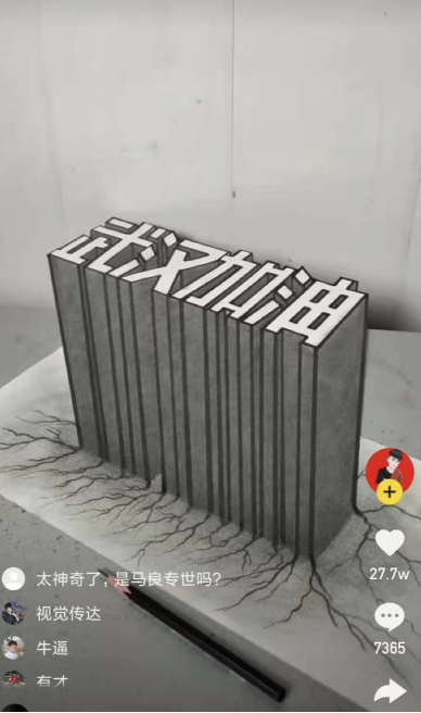 自學(xué)繪畫者“阿升”( ID:shi000666)用一張紙,一支筆,一把尺子,便將“武漢加油”四個(gè)字描摹得立體感十足,如同手工3D打印一般。像一個(gè)建筑一樣高聳矗立著。該條視頻獲得老鐵27.7萬(wàn)點(diǎn)贊。
