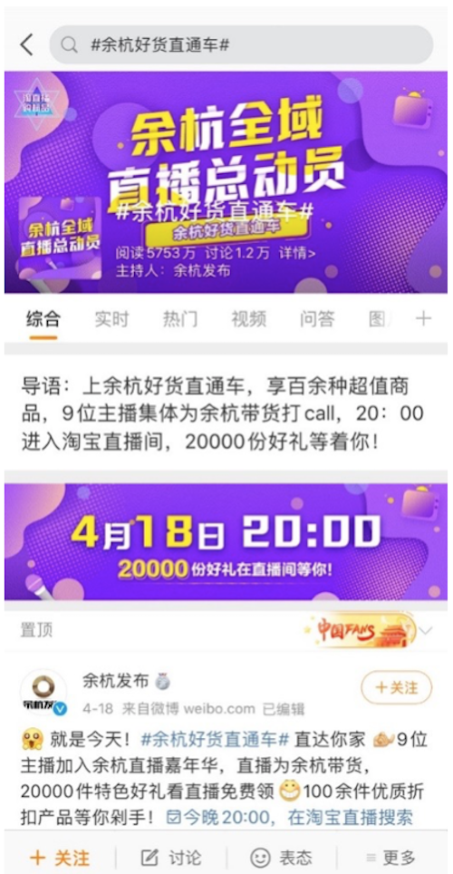 本次#余杭好貨直通車#的宣推充分認識到了流量的重要作用。在直播前,@余杭發(fā)布 充分利用微博的巨大聲量進行傳播推廣,再導流到淘寶進行進一步的經濟轉化。作為一個綜合平臺,微博在這個過程中能夠為品牌提供直播前、直播中、直播后期的全流程話題營銷。在微博進行前期宣推,到淘寶進行直播售賣,最后再回到微博進行效果傳播、品牌印象加固,形成了一次直播帶貨活動的完美閉環(huán)。