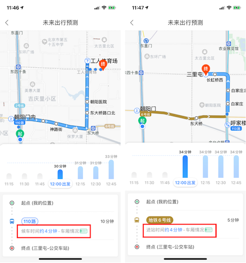 (“未來出行”功能可預(yù)估公交候車、地鐵進(jìn)站時間以及車廂內(nèi)擁擠情況)