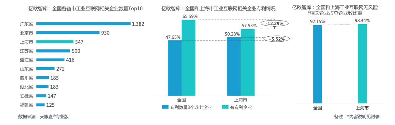 工業(yè)互聯(lián)網(wǎng),是第二產(chǎn)業(yè)數(shù)字化代表行業(yè)。據(jù)天眼查數(shù)據(jù)顯示,上海市工業(yè)互聯(lián)網(wǎng)相關(guān)企業(yè)547家,位居全國(guó)第三,擁有3個(gè)及以上專利企業(yè)占比50.28%,高于全國(guó)水平;無(wú)風(fēng)險(xiǎn)企業(yè)占比98.44%,基本和全國(guó)持平,行業(yè)整體呈低風(fēng)險(xiǎn)狀態(tài)。