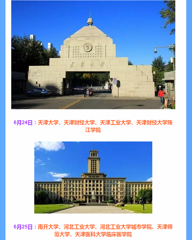 三、電臺訪談:天津人民廣播電臺將邀請市教育招生考試院、警備區(qū)招生辦、高校招生辦負(fù)責(zé)同志介紹高校招生情況,解答考生填報志愿的相關(guān)問題。具體播出時間:6月24日至26日,天津人民廣播電臺新聞廣播(每晚19:00—20:00);6月22日至27日,天津人民廣播電臺經(jīng)濟(jì)廣播(每天早晨7:30— 8:30);6月21日至23日、27日,天津市廣播電視臺濱海廣播《都市零距離》(每天下午16:00—17:00)。