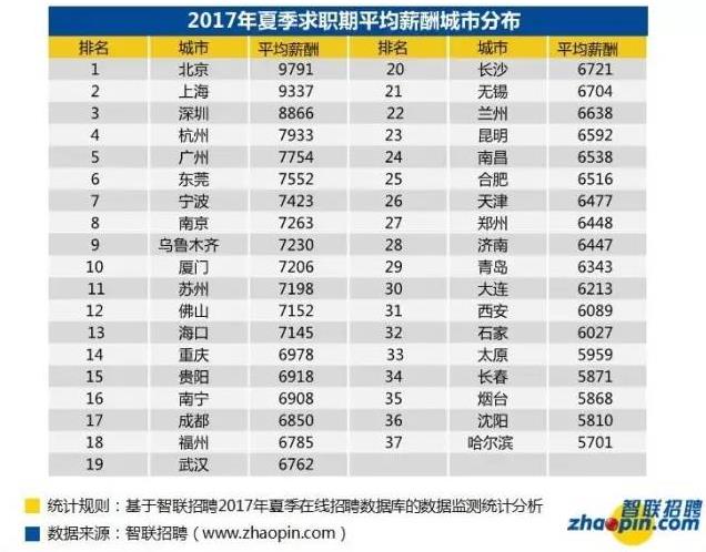 報(bào)告顯示,2017年夏季求職期,全國37個(gè)主要城市的平均招聘月薪為7376元,本季度平均薪酬下降幅度較大,為3.8%。其中,北京的平均薪酬水平依然保持第一名,為9791元。