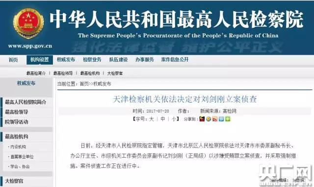 日前,經(jīng)天津市人民檢察院指定管轄,天津市北辰區(qū)人民檢察院依法對天津市市委原副秘書長、辦公廳主任、市級機關(guān)工作委員會原副書記劉劍剛(正局級)以涉嫌受賄罪立案偵查,并采取強制措施。案件偵查工作正在進行中。