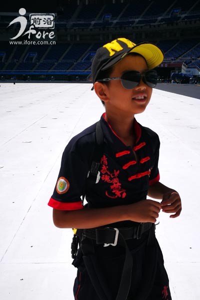 7月底,潘天順正式進(jìn)組訓(xùn)練,每天訓(xùn)練七八個(gè)小時(shí),從那時(shí)起他有了一個(gè)新的稱呼——“津娃”,很多熟悉他的工作人員甚至不知道他的名字,漸漸地他也就習(xí)慣了人們這么叫他。開幕式中“津娃”第一次出場(chǎng)需要吊威亞,聽說(shuō)要吊威亞潘天順興奮不已,直到真的被游絲吊在15米的空中左搖右晃嚇得哇哇大叫的時(shí)候,他才知道沒那么簡(jiǎn)單。威亞訓(xùn)練讓潘天順記憶猶新,吊威亞的游絲很軟,他不僅要在威亞上掌握平衡避免左右擺動(dòng),還要完成導(dǎo)演要求的指定動(dòng)作。他每次要在威亞上呆30到40分鐘,每天四五個(gè)小時(shí)被吊在高空,胯部和腰部經(jīng)常被威亞裝備勒出淤青。潘天順的指導(dǎo)老師魏珊珊告訴“津云”-前沿新聞?dòng)浾,不管多苦、多累,他從?lái)都不抱怨,每次都是老師主動(dòng)問(wèn)他,是不是累了,是不是需要休息。