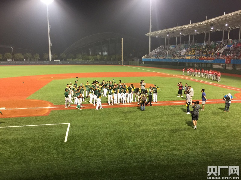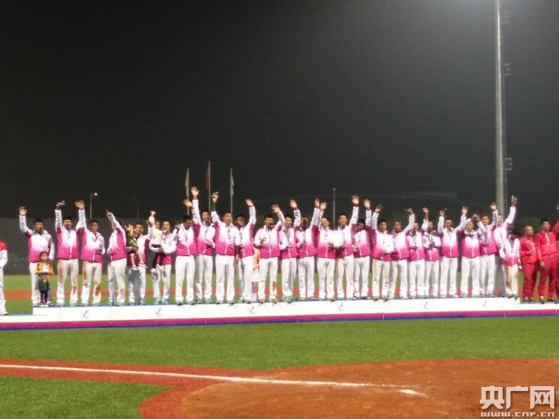 天津棒球隊(duì)站在冠軍領(lǐng)獎臺上。 -