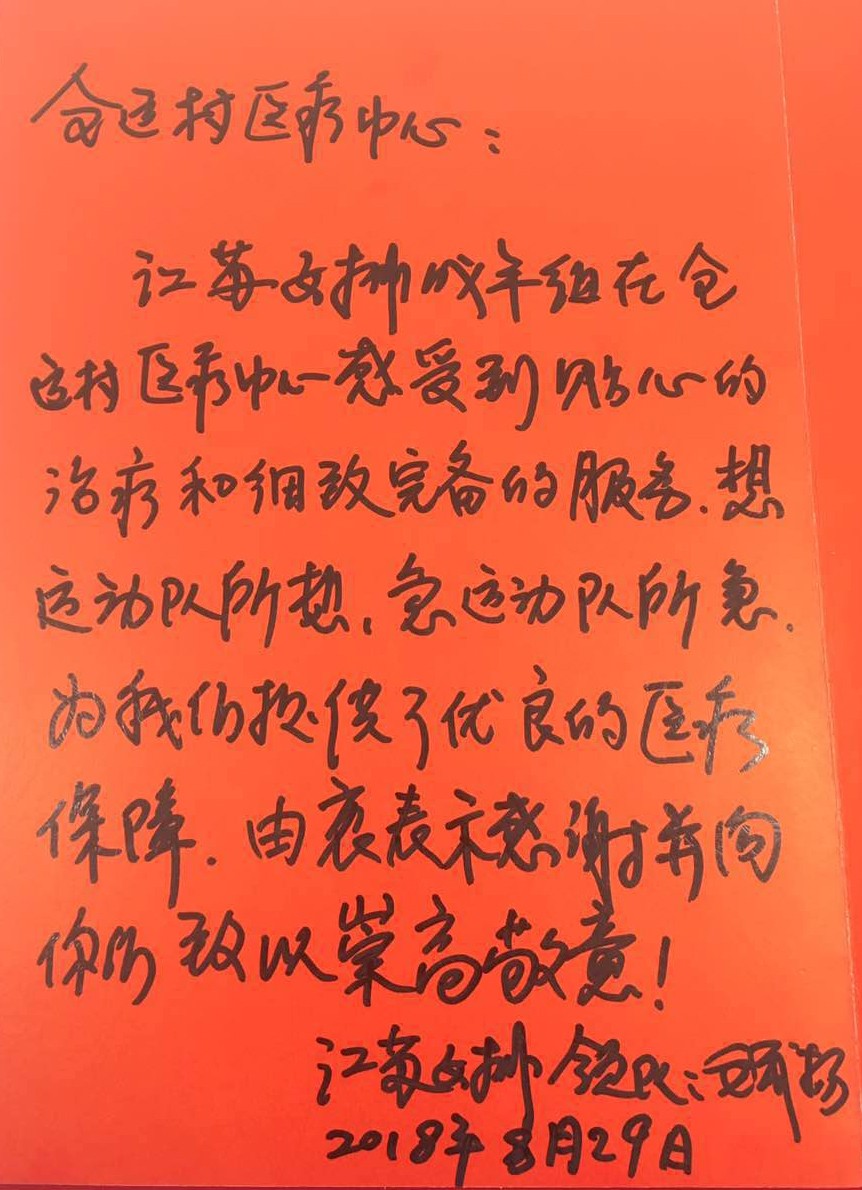 冠軍運(yùn)動(dòng)員張高泉對我院醫(yī)護(hù)人員的周到服務(wù)、快速轉(zhuǎn)運(yùn)、精心診治表示非常感謝,表示“此次來津參加全運(yùn)會比賽,不僅收獲了金牌,還感受到了天津人民的熱情,尤其是三中心醫(yī)院醫(yī)護(hù)人員的優(yōu)質(zhì)、專業(yè)的醫(yī)療保障服務(wù)給自己留下了深刻的印象,非常的感謝他們!