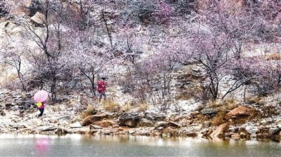 昨天,天津市薊州區(qū)盤山等多座山峰迎來了小雪天氣,恰逢山桃燦爛,白色的落雪飄落在或粉或紅的桃花上,形成了津城春季罕見而又美麗的桃花雪景觀,讓登山游覽的游客驚嘆不已。(錢進 攝)