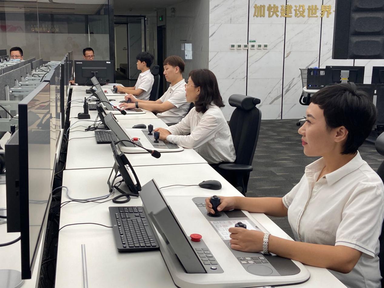 天津港智慧港口的建設也改變了港口人的工作方式。遠程自動化操控司機丁亞楠(右一)在中央控制室遠程控制集裝箱的裝卸,每天可以完成最多660個集裝箱的抓取。右五為丁亞楠丈夫張洪宇。(央廣網(wǎng)記者 李欣 攝)