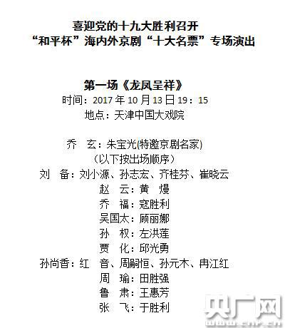 記者了解到,演出采取“多人飾一角,接續(xù)登場”的方式進(jìn)行。其中,13日演出的全本《龍鳳呈祥》將特邀京劇名家朱寶光領(lǐng)銜出演喬玄,由天津京劇院優(yōu)秀青年演員左洪蓮飾演孫權(quán)。昔日的“十小名票”劉小源將與孫志宏、齊桂芬、崔曉云一起聯(lián)袂登場飾演劉備。紅音、周嗣恒、孫元木、冉江紅飾演孫尚香。顧麗娜飾演吳國太、黃熳飾演趙云、寇勝利飾演喬福、邱光勇飾演賈化、田勝強(qiáng)飾演周瑜、王惠芳飾演魯肅、于勝利飾演張飛。