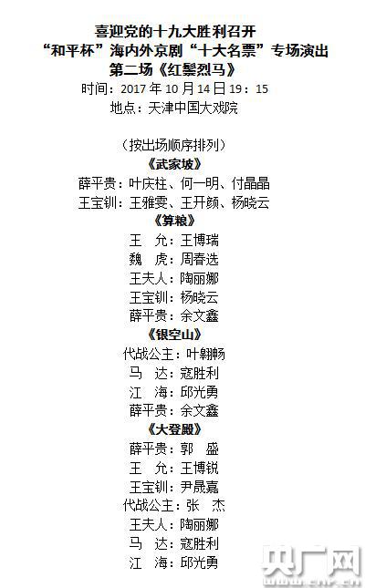 10月14日演出《紅鬃烈馬》,包括《武家坡》、《算糧》、《銀空山》、《大登殿》四折。薛平貴由葉慶柱、何一明、付晶晶、余文鑫、郭盛飾演。王寶釧由王雅雯、王開顏、楊曉云、尹晟嘉飾演。陶麗娜飾演王夫人、已經(jīng)成為專業(yè)演員的葉翱暢和張杰飾演代戰(zhàn)公主、王博瑞飾演王允、周春選飾演魏虎、寇勝利、邱光勇飾演馬達(dá)、江海。兩場演出均由天津京劇院擔(dān)任助演,充分體現(xiàn)出專業(yè)院團(tuán)為弘揚(yáng)國粹藝術(shù)甘當(dāng)綠葉的品質(zhì)。