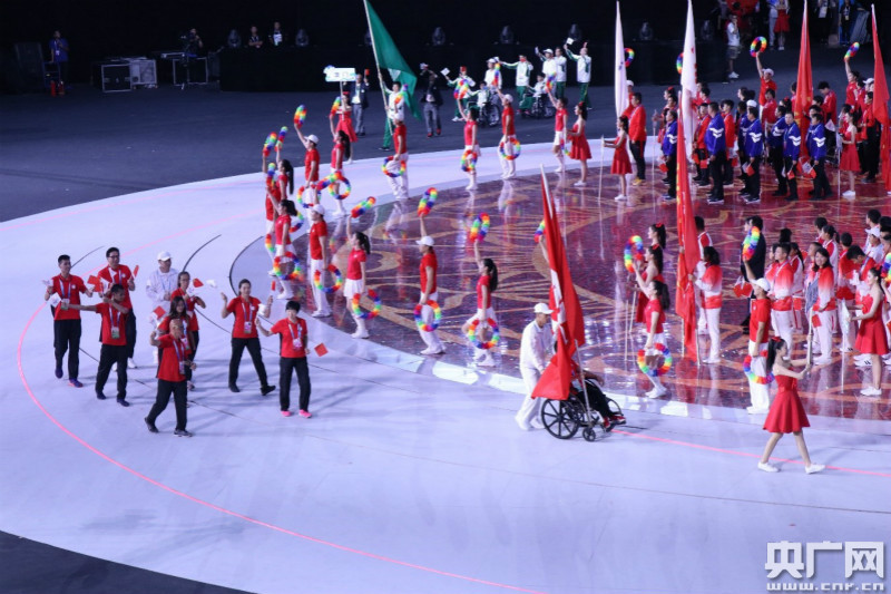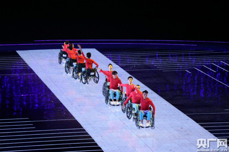 開幕式于當(dāng)晚20時正式開始。在護(hù)旗手的護(hù)衛(wèi)下,中華人民共和國國旗、殘運(yùn)會會旗、特奧會會旗分別入場。隨后裁判員代表方隊和35個代表團(tuán)的殘疾人運(yùn)動員代表依次入場。