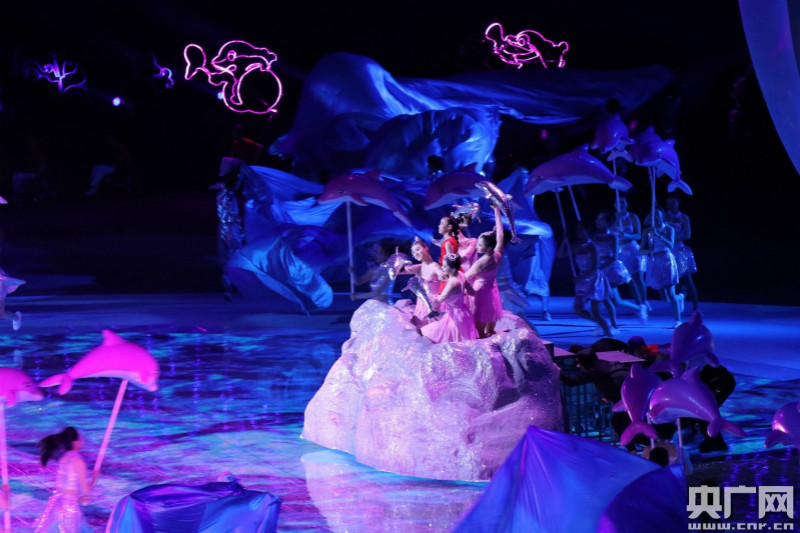 “5、4、3、2、1”伴隨著倒計時,開幕式文體展演拉開帷幕。一位身著紅色衣服的盲女在“小海豚”的幫助下重獲自信。碧波海浪過后,第二個展演作品殘疾人運(yùn)動員用競速方式展現(xiàn)了頑強(qiáng)拼搏、不屈不撓的體育精神。開幕式文體展演主題為《擁抱陽光》,共分為四個篇章,講述一個讓人內(nèi)心感動而嘴角上揚(yáng)的溫暖故事。故事從“同沐陽光”勇敢的開始,以“生命陽光”深情的歌詠,借“共享陽光”相互支撐,最終贏得生命的褒獎,讓信念與勇敢織就出“擁抱陽光”。開幕式參演演員800余人,其中包括殘疾人演員、高校演員和專業(yè)院團(tuán)演員。