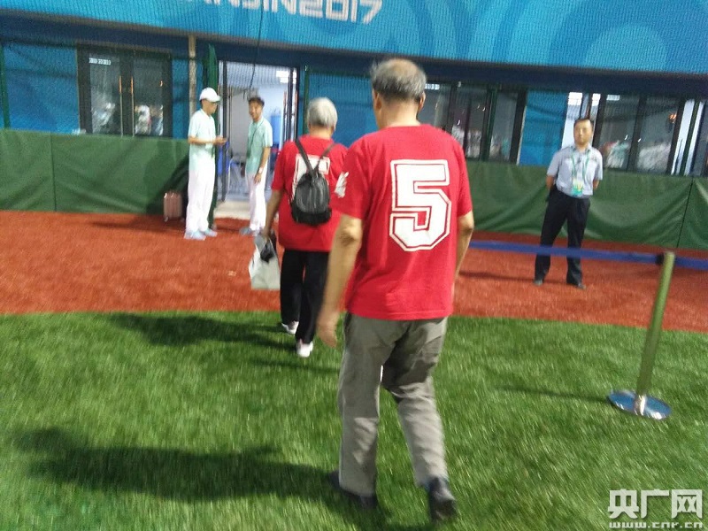 兩位身著棒球隊服的老人在與喜愛的球員合影后心滿意足的離開