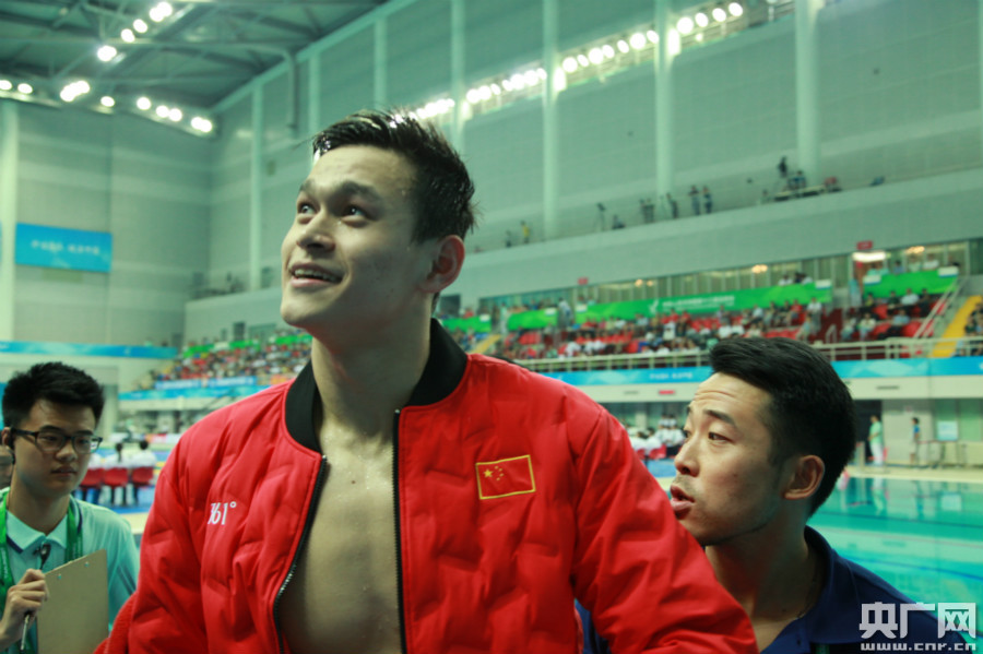 央廣網(wǎng)天津8月31日消息(記者劉陽(yáng) 褚夫晴)31日晚,天津奧林匹克體育中心跳水游泳館內(nèi)歡聲雷動(dòng),連續(xù)四次征戰(zhàn)全運(yùn)會(huì)的孫楊在男子400米自由泳決賽中順利實(shí)現(xiàn)全運(yùn)三冠王,以3分41秒94的成績(jī)奪得金牌,山東隊(duì)的季新杰和上海的邱子傲以3分47秒52和3分49秒52的成績(jī)分獲二三名。