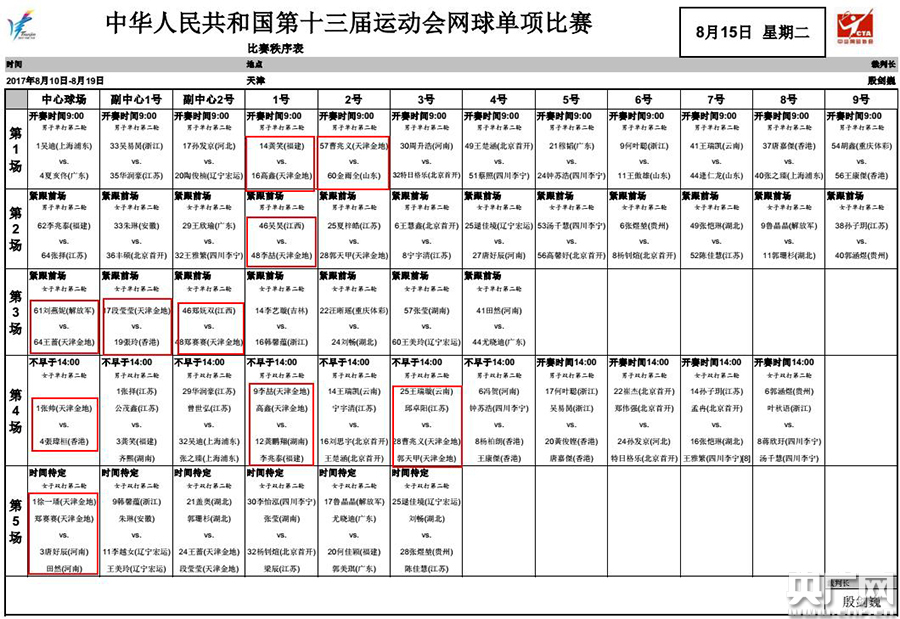 十三運(yùn)網(wǎng)球單項(xiàng)比賽8月15日賽程