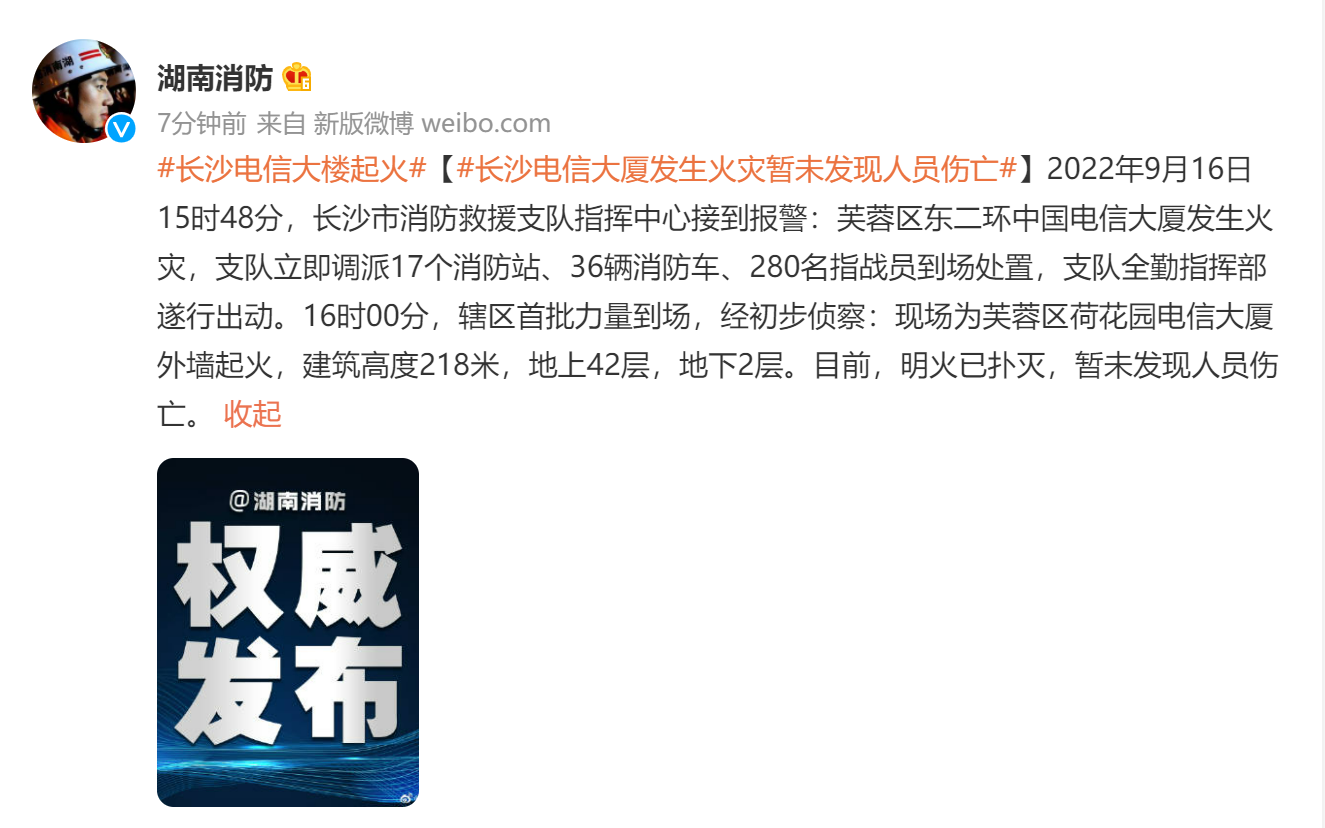 湖南消防通報長沙電信大廈火災(zāi):暫未發(fā)現(xiàn)人員傷亡
