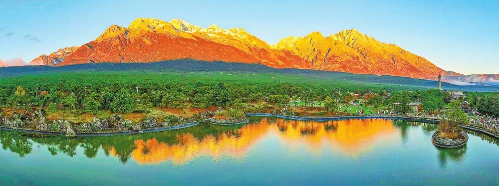 在麗江,觀賞“日照金山”的地點(diǎn)眾多。甘海子、藍(lán)月谷等地可近距離感受雪山的巍峨壯麗;獅子山觀景臺(tái)能俯瞰古城、遙望雪山;黑龍?zhí)豆珗@則是攝影師鐘愛(ài)的經(jīng)典機(jī)位——金色的山峰倒映潭中,與亭臺(tái)樓閣相映成趣,“雙份”美景令人沉醉。