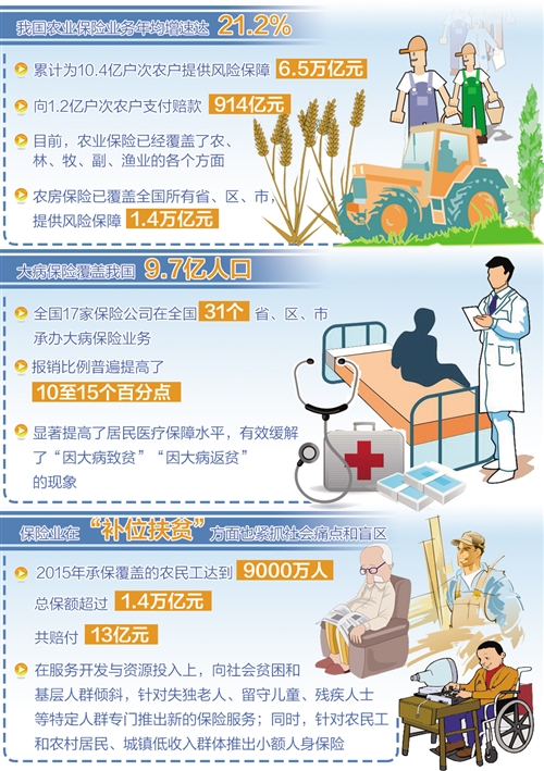 事實上,在當(dāng)前各種支持“三農(nóng)”建設(shè)的力量中,保險業(yè)是主力之一。數(shù)據(jù)顯示,2016年1月份到11月份,農(nóng)業(yè)保險原保險保費收入為390.49億元,同比增長11.18%。“十二五”時期,我國農(nóng)業(yè)保險業(yè)務(wù)年均增速達(dá)21.2%,農(nóng)業(yè)保險累計為10.4億戶次農(nóng)戶提供風(fēng)險保障6.5萬億元,向1.2億戶次農(nóng)戶支付賠款914億元。特別是2007年到2015年間,農(nóng)業(yè)保險業(yè)務(wù)規(guī)模增長迅猛,年均保費增長率高達(dá)51.65%。