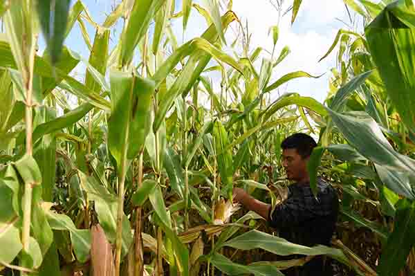 9月6日,黑龍江省富裕縣龍安橋鎮(zhèn)富欣村的種糧大戶袁鳳波在查看自家玉米受旱情影響情況。袁鳳波今年種植玉米約2000畝,他預(yù)計(jì)受旱情影響將減產(chǎn)約五成。