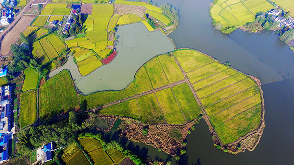 金秋十月,江蘇省揚(yáng)州市槐泗鎮(zhèn)晚稻大面積成熟,稻田猶如一塊塊金色“地毯”,構(gòu)成一幅美麗的豐收畫卷。