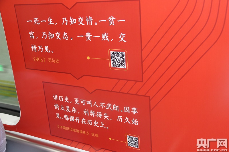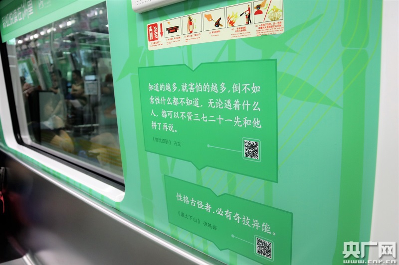 上午10點(diǎn)45分,陳先生帶著放暑假的兒子在慶春廣場(chǎng)地鐵站,坐上了彩虹悅讀列車(chē)。走進(jìn)車(chē)廂,濃濃的閱讀氛圍撲面而來(lái),車(chē)廂內(nèi)印著一段段精選書(shū)摘,有選自錢(qián)穆先生《中國(guó)歷代政治得失》的“講歷史,更可叫人不武斷。因事情太復(fù)雜,利弊得失,歷久始見(jiàn),都擺開(kāi)在歷史上”;有摘自古龍《絕代雙驕》的“知道的越多,就害怕的越多,倒不如索性什么都不知道,無(wú)論遇著什么人,都可以不管三七二十一先和他拼了再說(shuō)”;有選自東野奎吾《惡意》的“令他害怕的,并非暴力本身,而是那些討厭自己的人所散發(fā)的負(fù)面能量。他從來(lái)沒(méi)有想象過(guò),在這世上竟然會(huì)有這樣的惡意存在”;還有選自加西亞·馬爾克斯所著《霍亂時(shí)期的愛(ài)情》的愛(ài)情告白:“愛(ài)情是一種本能,要么第一次就會(huì),要么就一輩子也不會(huì)”等等。