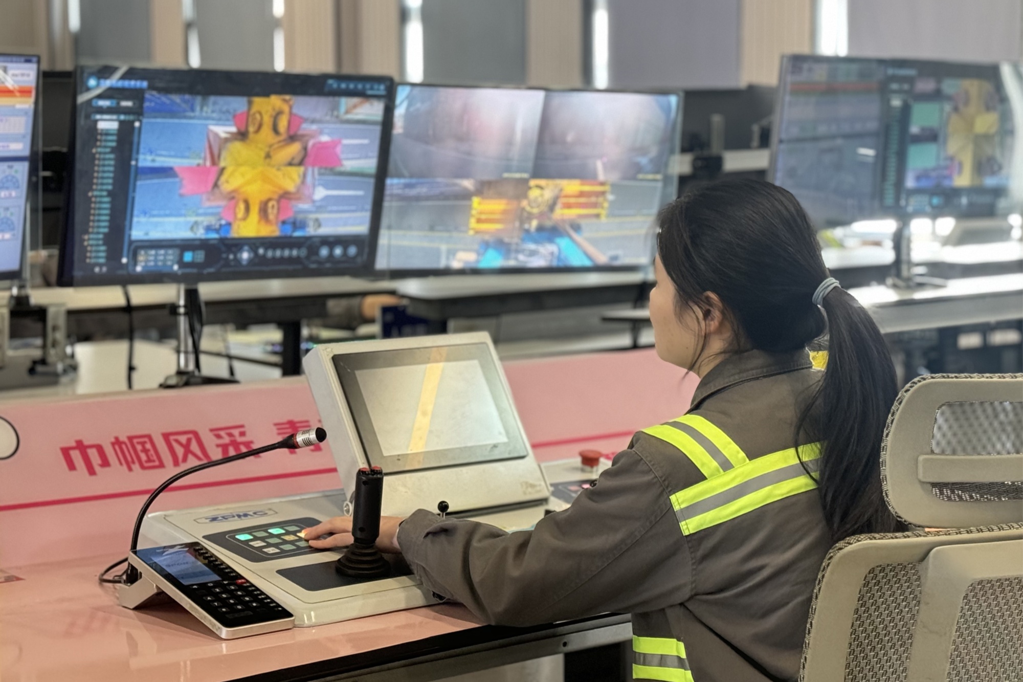 “以前操作龍門吊,得在幾十米高的駕駛室里彎腰低頭一人一機(jī)緊盯作業(yè),現(xiàn)在在操作間室輕點(diǎn)屏幕,就能精準(zhǔn)完成集裝箱起吊。”龍門吊女司機(jī)李麗提起如今的作業(yè)變革模式,語氣里滿是藏不住的自豪。在遠(yuǎn)程操控室內(nèi),只見李麗手指在屏幕上滑動(dòng),第一視角作業(yè)畫面就能實(shí)時(shí)傳輸,自動(dòng)化機(jī)械臂精準(zhǔn)抓取集裝箱!案蹍^(qū)上百臺(tái)龍門吊僅僅需要30個(gè)人就能完成,這在以前想也不敢想!彼a(bǔ)充道。