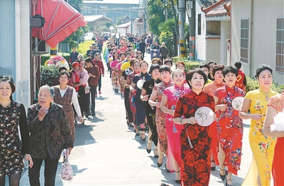 昨日,藍(lán)天白云下的鄞州區(qū)姜山鎮(zhèn)陸家堰村處處歡聲笑語。當(dāng)天,白鶴街道丹頂鶴社區(qū)的150多位客人,帶著形式多樣的文藝節(jié)目,走進(jìn)陸家堰村。據(jù)介紹,陸家堰村正在創(chuàng)建全國文明村莊,而丹頂鶴社區(qū)正在創(chuàng)建全國文明社區(qū),通過這次文化走親活動(dòng),村莊、社區(qū)相互借鑒,共建文明。圖為身著旗袍的“鋒之社”舞蹈戲曲隊(duì)的成員,在村里展示旗袍秀。(記者 胡龍召 范丁杰)