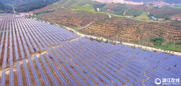 10月10日,湖州市吳興區(qū)埭溪鎮(zhèn)東紅村光伏發(fā)電項目。發(fā)電基地面積1400畝,原為廢棄多年的礦山。整個項目分兩期,目前一期700畝已經建成并網發(fā)電,千余村民每人每年因此增加1000多元的土地出租收入。(浙江在線拍友 鄧德華 何偉衛(wèi) 攝)